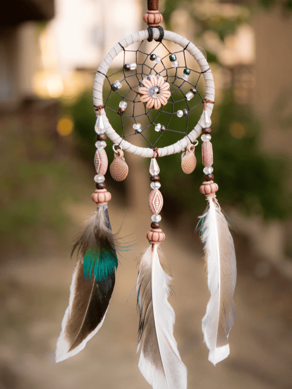 Small Beige Dreamcatcher with Brown Feathers and Wooden Beads